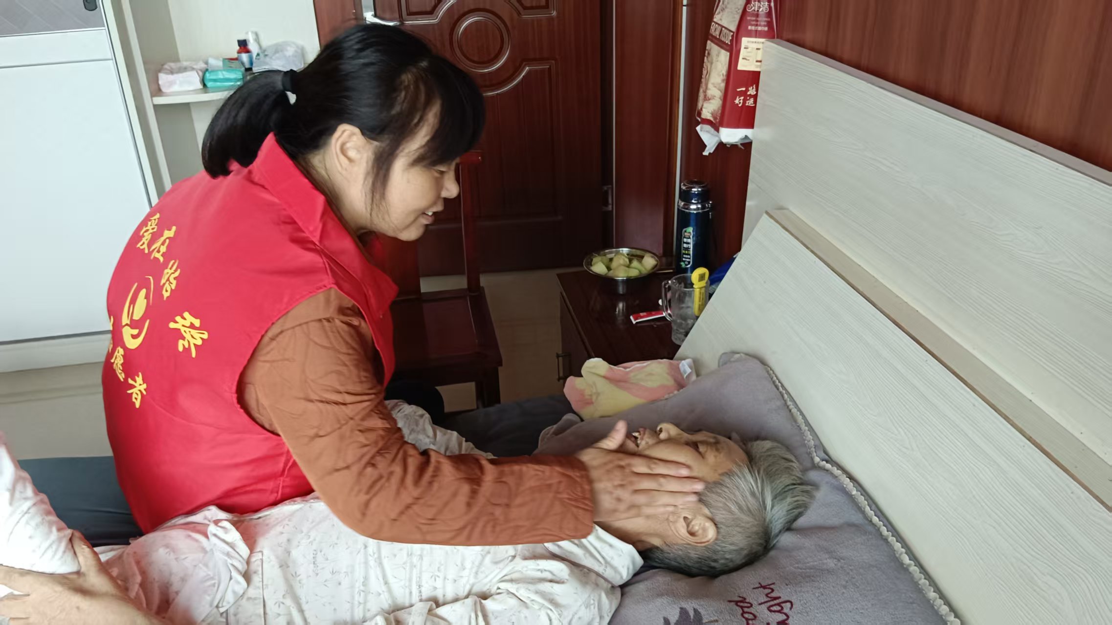 志愿者轮流照顾老人,安抚老人,擦洗身体,陪伴老人,祝福老人少点疼痛过好每一天。