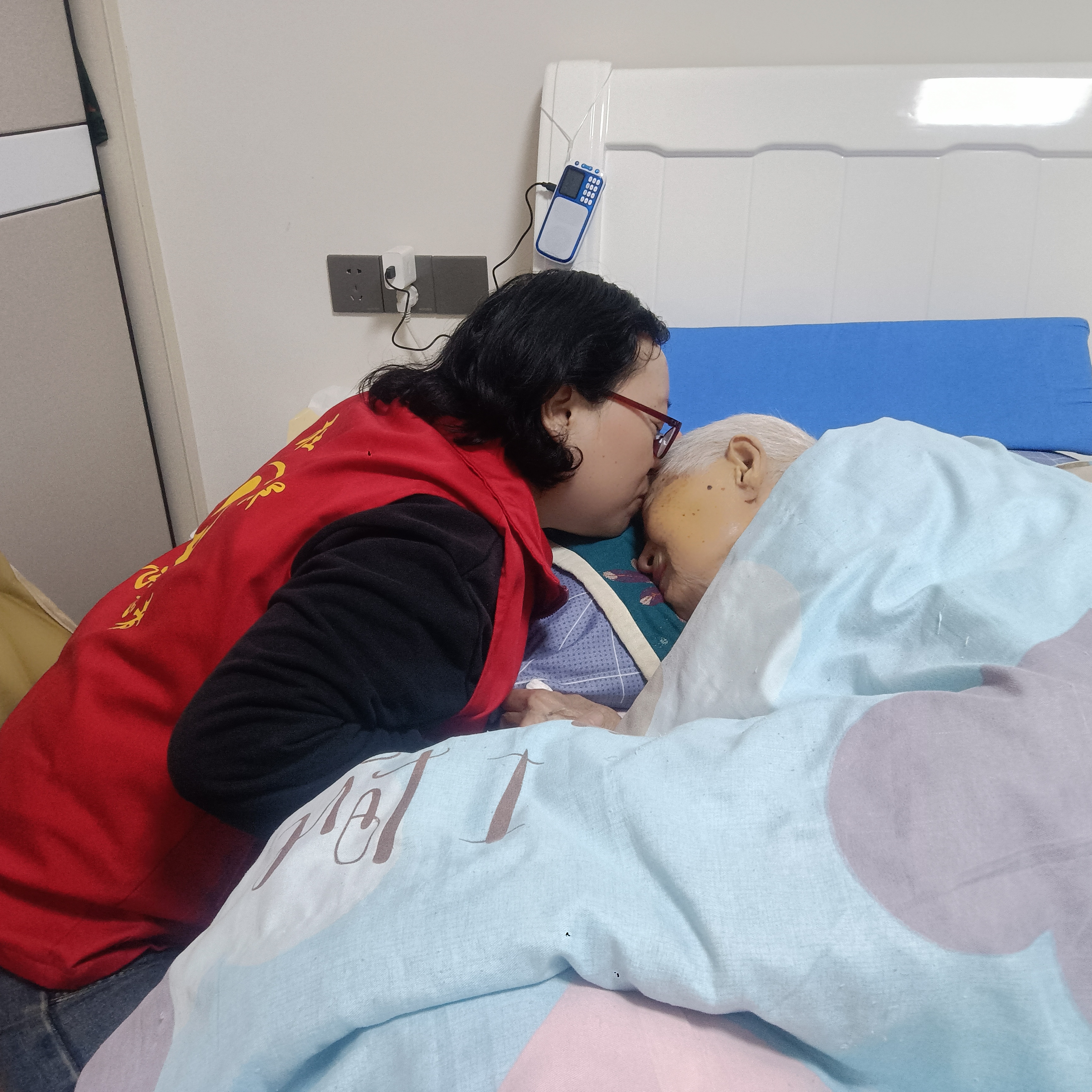 志愿者轮流照顾老人,擦洗身体,安抚陪伴老人,祝福老人没有疼痛过好每一天。