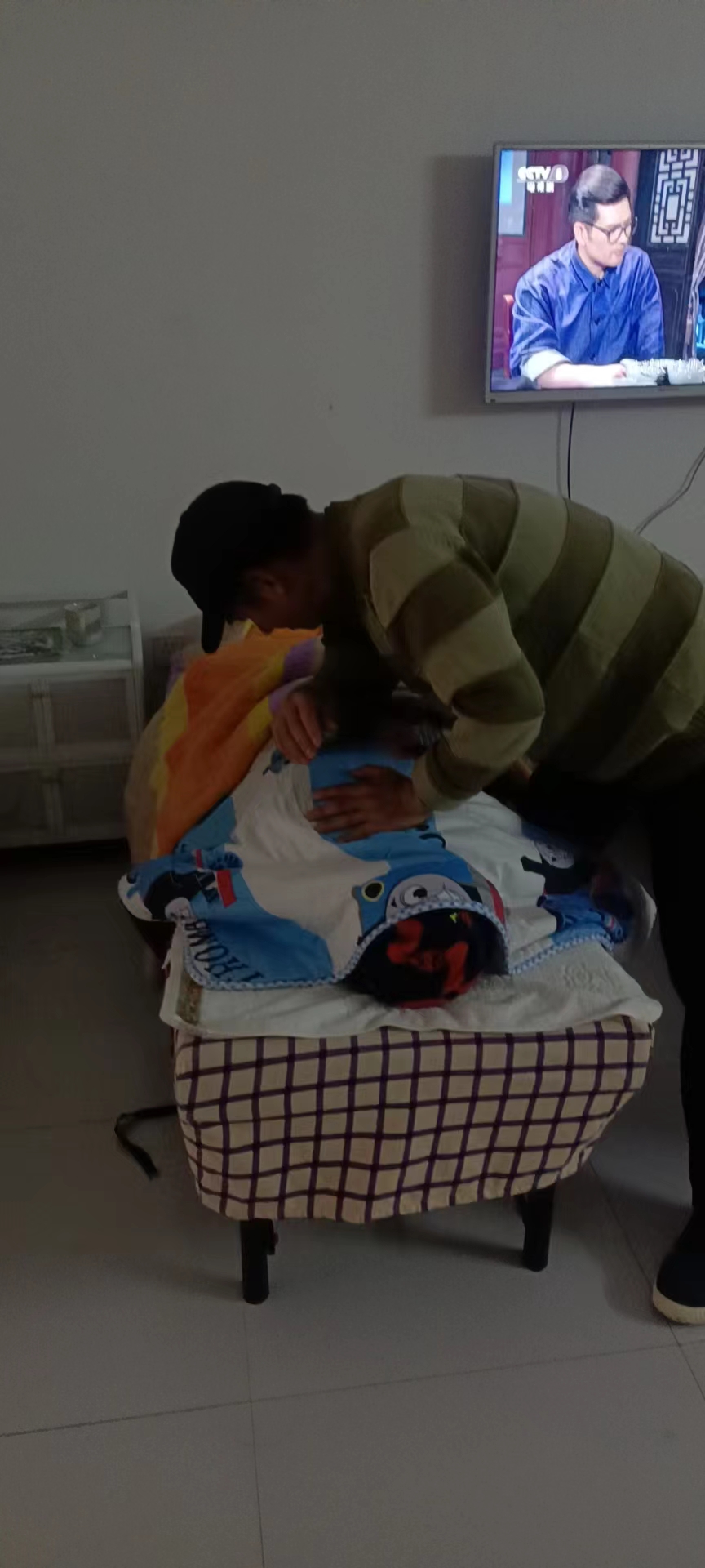 原始点健康调理中心志愿者,继续为老年食堂义工李大姐,热敷调理身体。